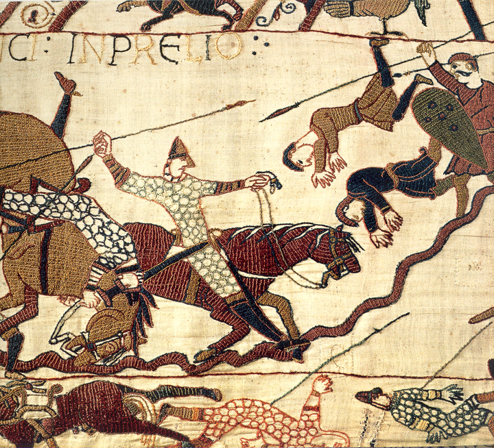... [H]ic ceciderunt si mul Angli et Fanci in prelio ; Tapisserie de Bayeux, XIe siècle
